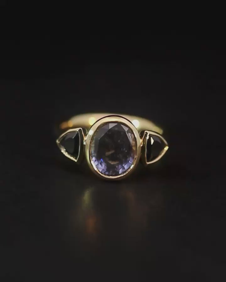 The Lumen Trilogy Ring is a solid gold statement ring with a polished finish, defined by a center oval purple Spinel and flanked by two trillion cut lilac Spinels. Symbolising a love that endures through ages past, present, and yet to come.