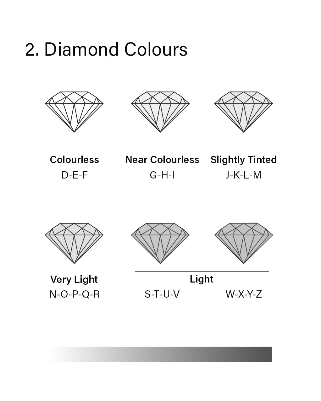 Diamonds are graded according to their colour based on a letter system starting with D (colourless) to Z (saturated). Whilst colourless diamonds are the most popular, intensely coloured diamonds such as yellow, red, green, blue or black are termed "fancy" colour diamonds.