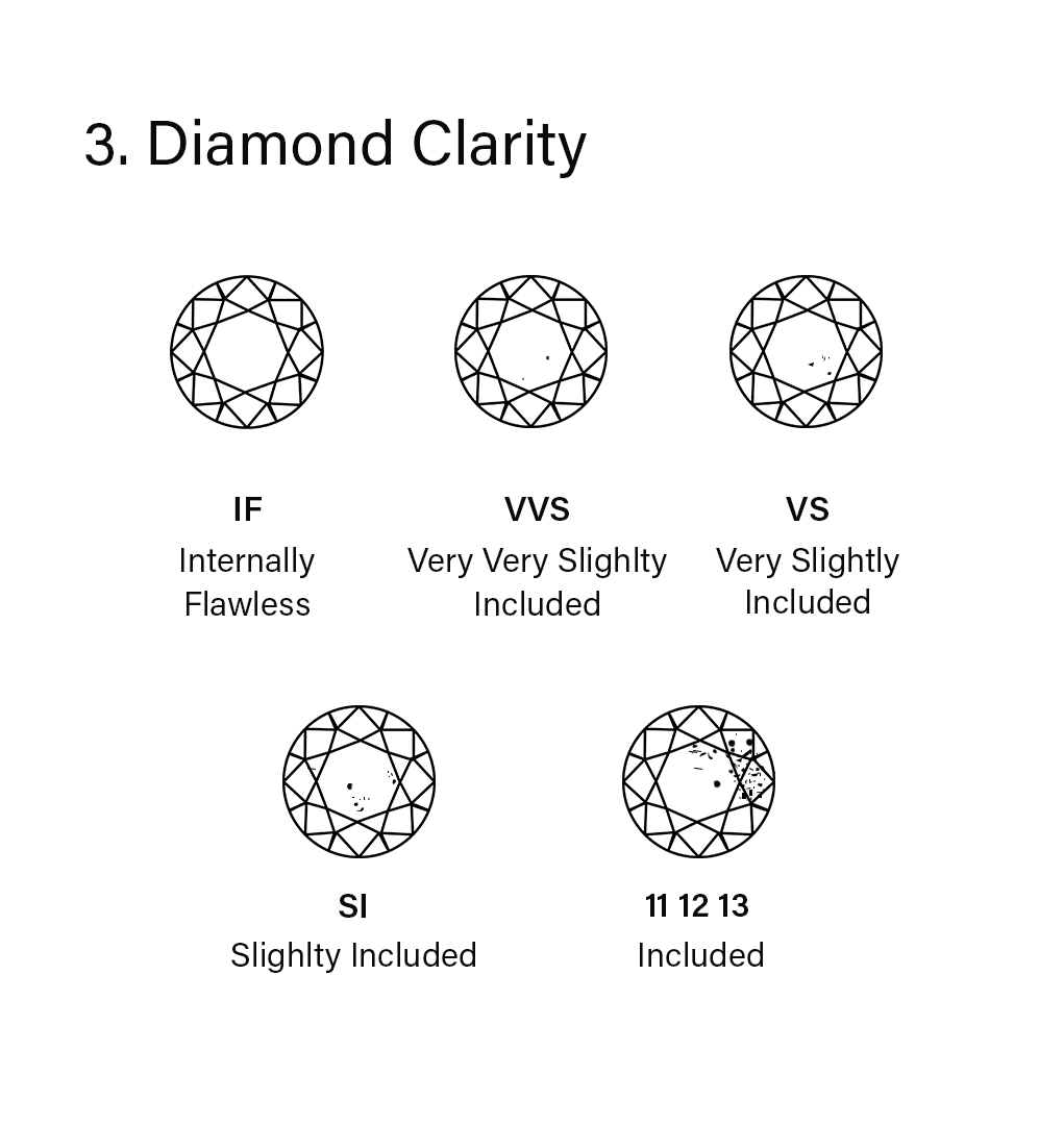 Clarity affects a diamond's appearance. Diamonds with higher clarity grades display more brilliance. Diamonds are graded for clarity on a scale that ranges from "Flawless" to "Included" In between these extremes, there are various grades as showcased below.